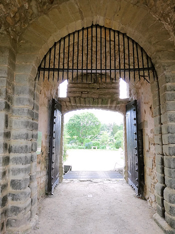 It's a very battered castle with a drawbridge and portcullis. Built in