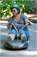 Above left; Deb with a New Zealand Falcon That helmet is just not my colour but the luge is a lot of fun |