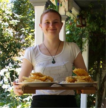 Fish and chips arrive with a lovely smile at The