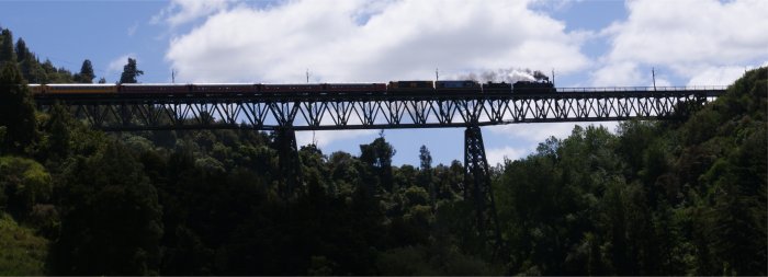 ![]() Caught this pic but it needs sound. This train blew it's whistle all the way across the viaduct; one of those Great Western wonderful whoopy whistles, it was magic ! We found out it was a special train, and was full of scouts who had been attending a huge jamboree at Feilding. |